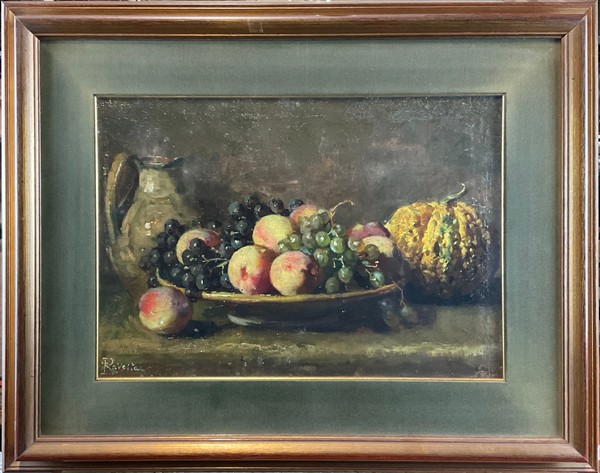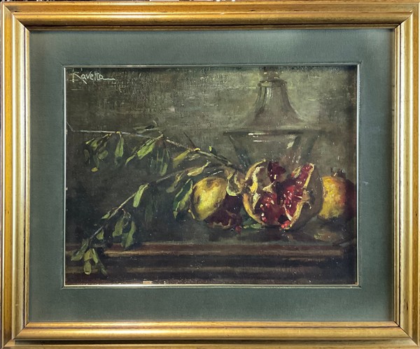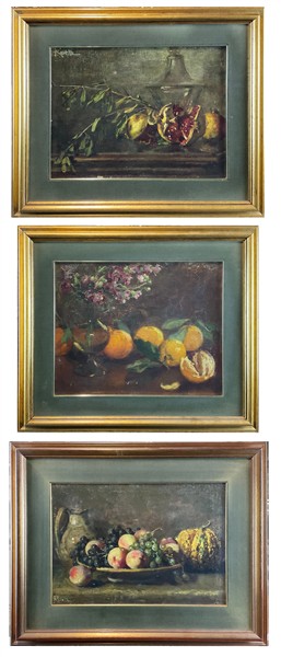 Enrico Ravetta "Tre composizio con frutta" olio su diversi supporti (cm max 32x