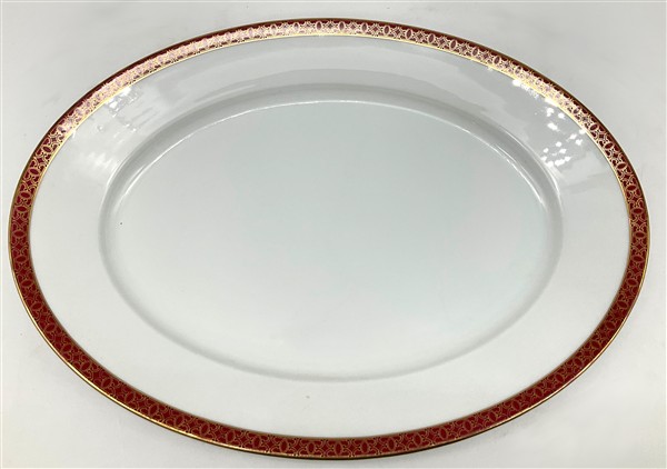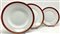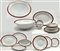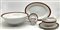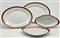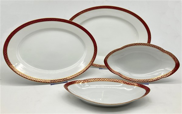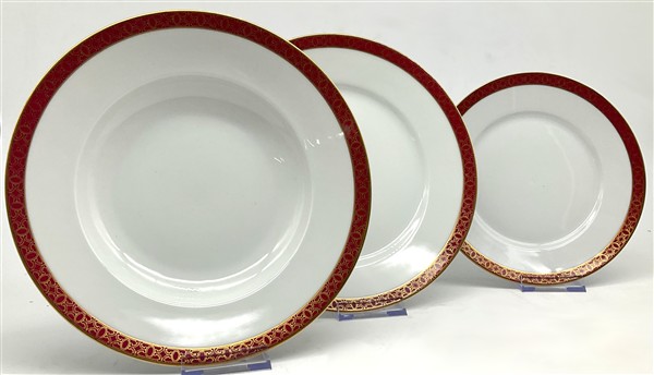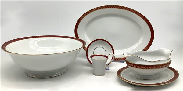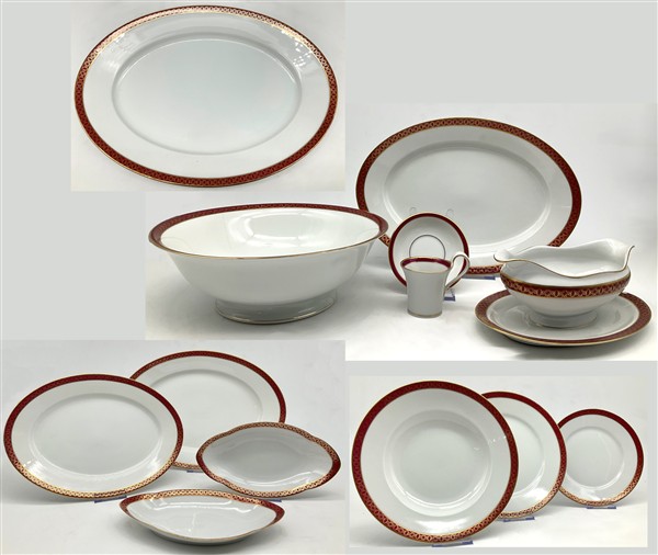 Manifattura Richard Ginori, inizio secolo XX. Parte di servizio in porcellana bianca con profili rosso e oro composto da trentatré piatti piani, dieci piatti fondi, dodici piattini, insalatiera, salsiera, quattro vassoi ovali, due raviere, unito a sei tazzine da caffè con piattini di manifattura differente (difetti)