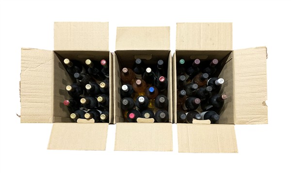 Lotto composto da oltre 20 bottiglie di vino in tre cartoni, tra le quali Romagnoli Malvasia e Pinot Grigio