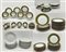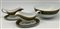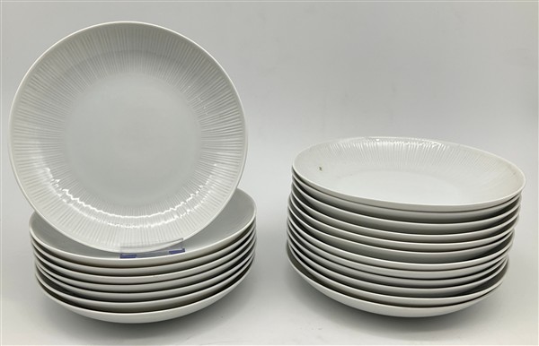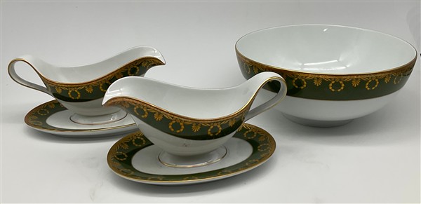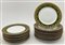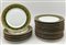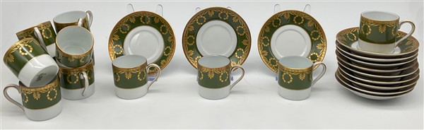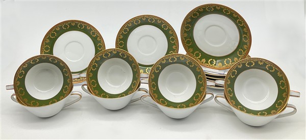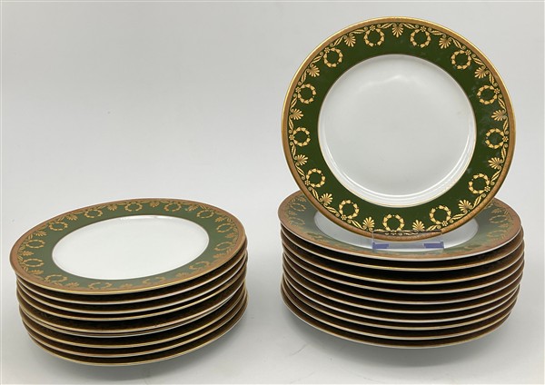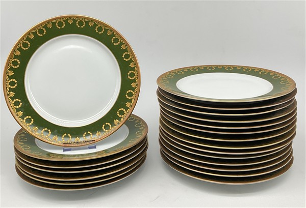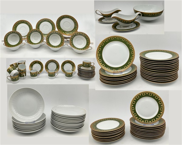 Manifattura Hutschen Reuther. Lotto composto da parte di servizio da tavola in porcellana con bordure in verde e oro composto da ventuno piatti piani, dieci medi, dieci piccoli, otto tazze da brodo con piatto, due salsiere, una insalatiera e dodici tazze da caffè con piattino, unito a venti piatti in porcellana bianca (difetti)