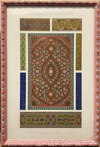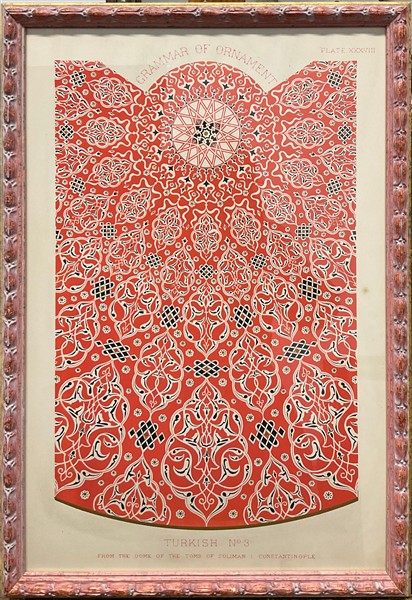 Coppia di litografie a colori raffiguranti motivi decorativi per pareti ed arredi turchi e indiani, tratte da "The Grammar of Ornament" di Jones Owen pubblicato per la prima volta nel 1856 (fogli cm 56x37) In cornici (lievi difetti)