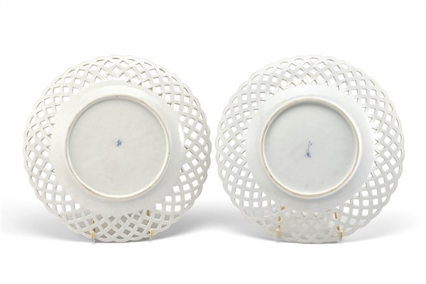 Manifattura di Meissen, secolo XVIII-XIX. Coppia di piatti in porcellana policroma con bordo traforato e cavetto decorato da mazzi di fiori. Marcati sotto la base (d cm 23,5) (difetti)
