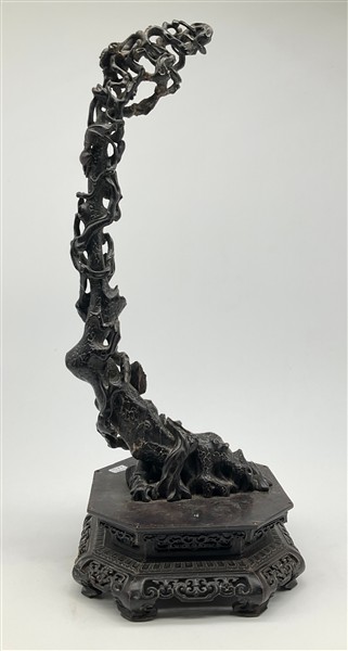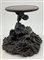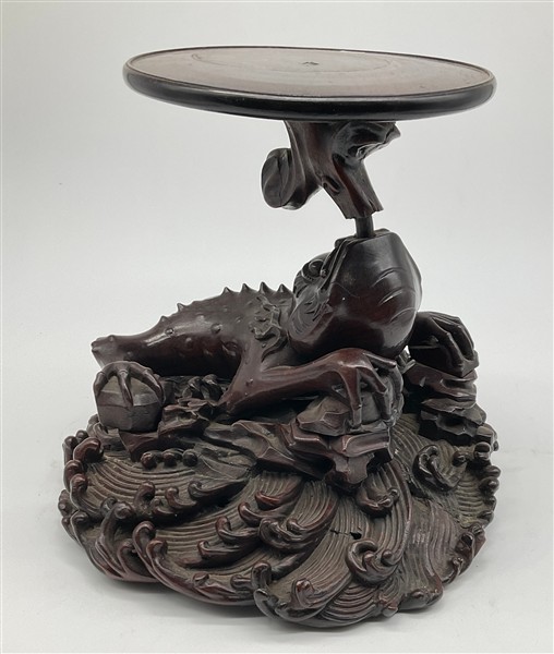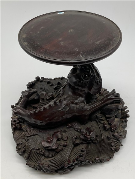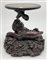 Coppia di basi in legno intagliato con sostegno ad animale fantastico e base a finte onde e piano circolare (h cm 29, d cm 29), unite a un sostegno in legno intagliato e tinto a ramo (h cm 43). Giappone, secolo XIX (difetti e rotture)