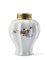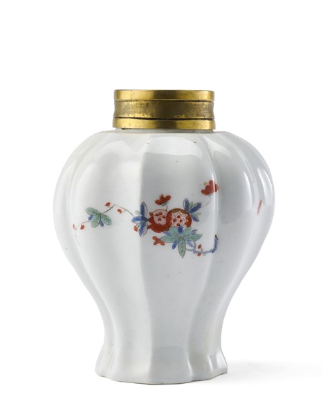 Manifattura di Meissen, secolo XVIII. Porta tè in porcellana policroma con decoro Kakiemon, coperchio in metallo dorato non pertinente (h cm 10,5) (difetti)