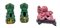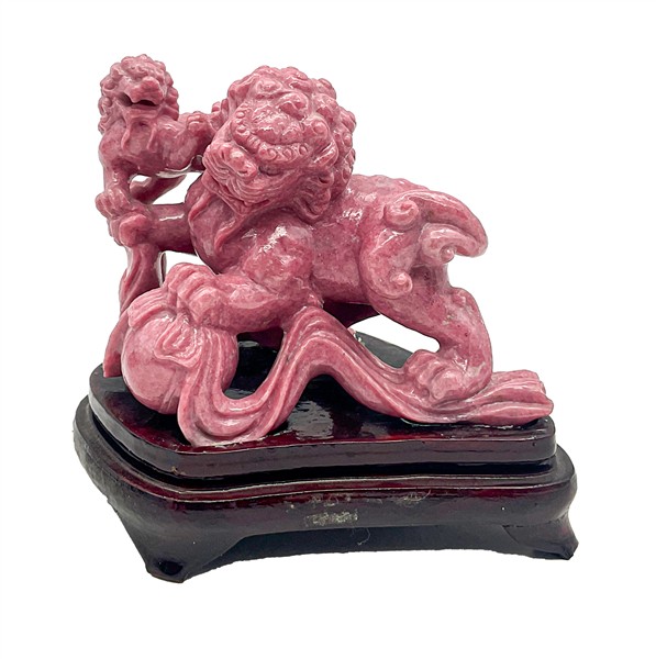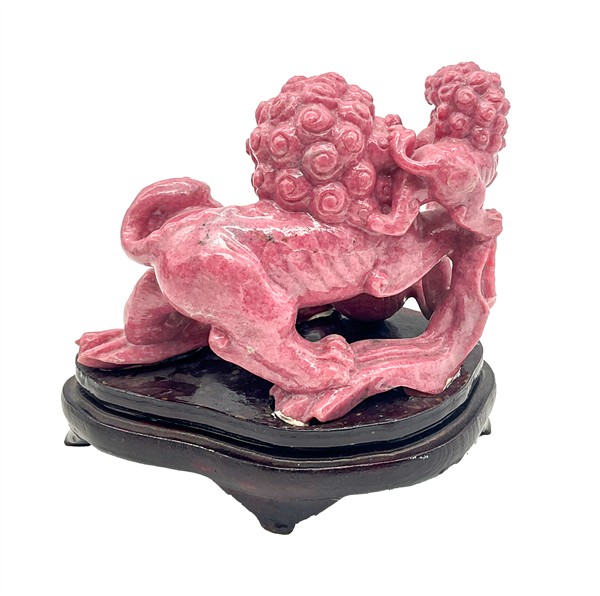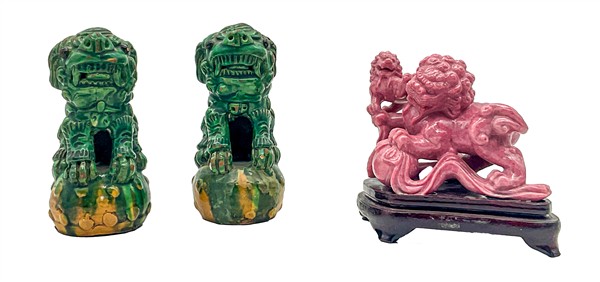 Lotto composto da due cani di Pho in porcellana con invetriatura Sancai ed una statuetta in pietra dura raffigurante leoni buddisti. Cina, secolo XX (h. max cm 14) (difetti e restauri)