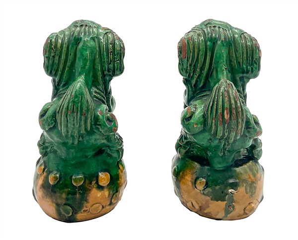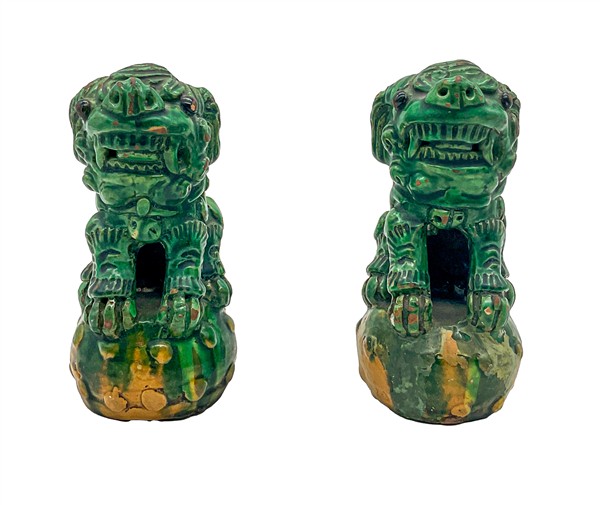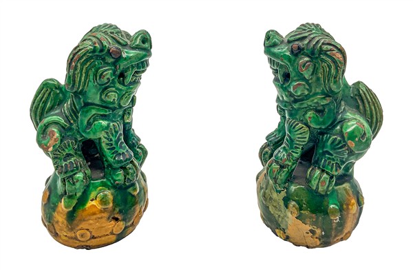Lotto composto da due cani di Pho in porcellana con invetriatura Sancai ed una