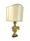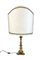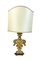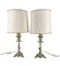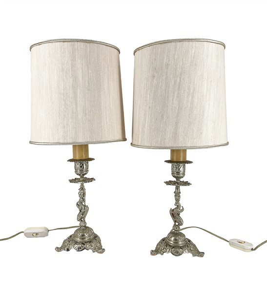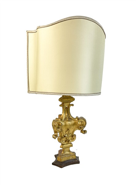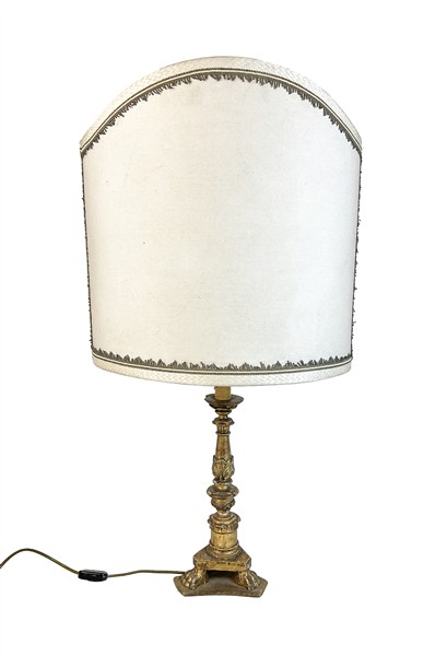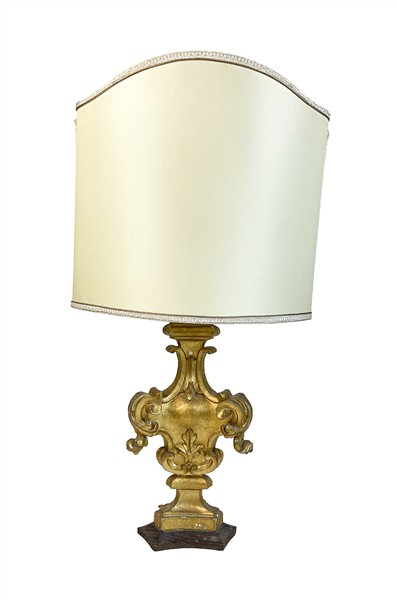 Lotto di di cinque diverse lampade d'appoggio di cui due con antico sostegno legno intagliato e dorato, due in metallo argentato e una in ottone, con paralumi (h max cm 87) (difetti)