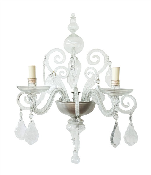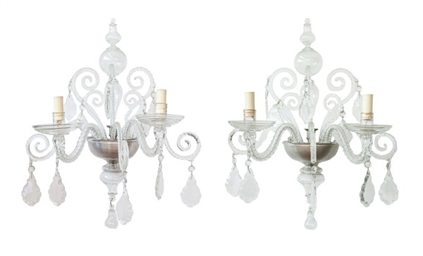 Manifattura di Murano, secolo XX. Coppia di applique a due luci con bracci a volute, pendenti sfaccettati, finale a pera (cm 58x50) (difetti)
