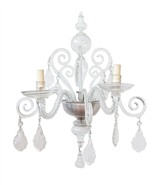 Manifattura di Murano, secolo XX. Coppia di applique a due luci con bracci a vo