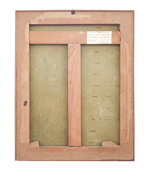 Ignoto, Crocifisso, terracotta patinata (cm 54x47) su pannello con cornice (cm 70x55) etichetta al retro "Esposto alla Mostra Biennale d'Arte Sacra Angelicana di Milano anno MCMLIII pezzo unico" con firma (difetti e restauri).