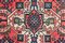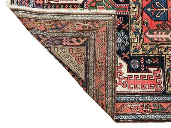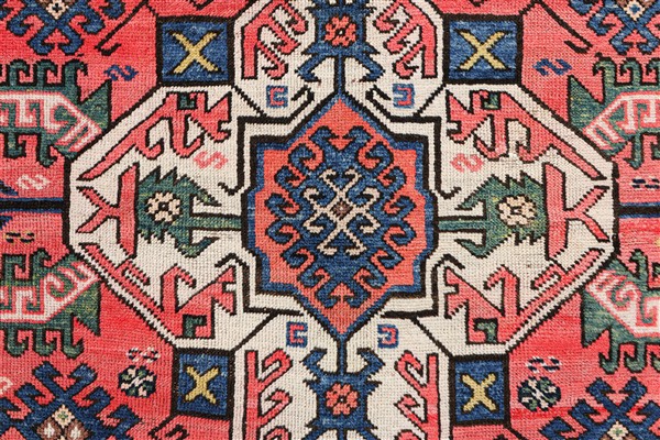 Tappeto galleria Kasim Ushag, Karabagh, Caucaso, inizio secolo XX. Decoro con medaglione a fondo bianco su campo rosso rosa decorato in policromia con motivi floreali stilizzati. Bordura a meandro su fondo rosso (cm 275x134) (difetti)