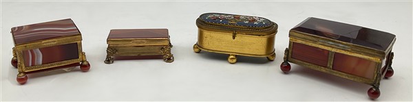 Lotto composto da quattro diverse scatoline in metallo dorato, pietra dura di cui una con coperchio decorato da micromosaico. Secolo XIX-XX (cm max 8x5,5) (difetti e rotture)