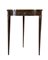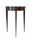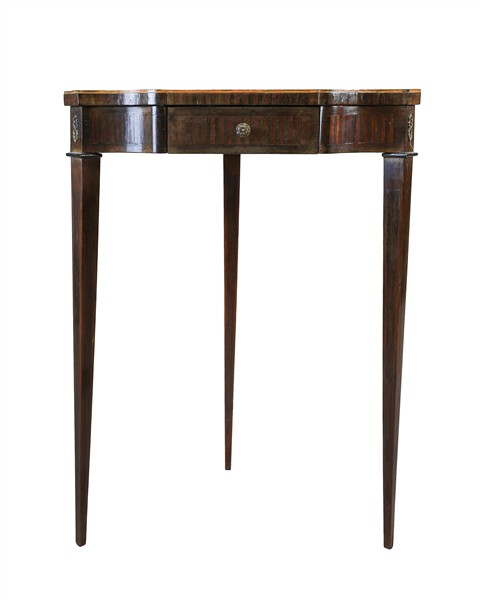 Gueridon in legni vari con piano sagomato ed alte gambe rastremate, un cassetto