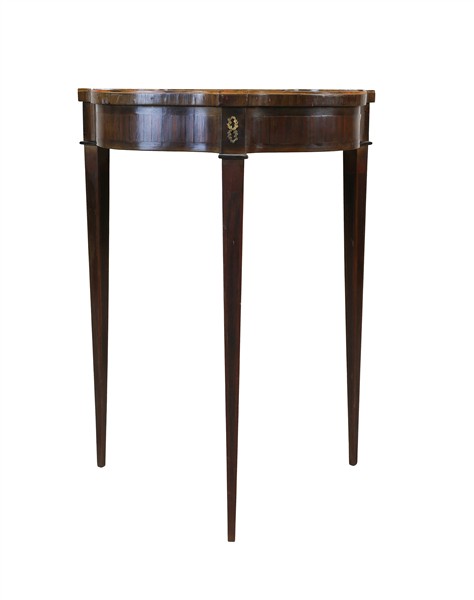 Gueridon in legni vari con piano sagomato ed alte gambe rastremate, un cassetto nella fascia (cm 52x70x36) (difetti)