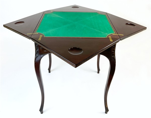 Tavolino da gioco "a fazzoletto" in mogano con piano apribile a spicchi e rives