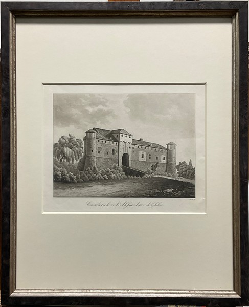 Gruppo di tre litografie monocrome raffiguranti monumenti piemontesi. In cornici (difetti)