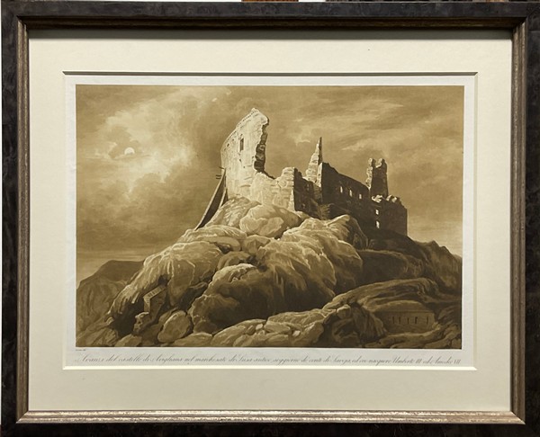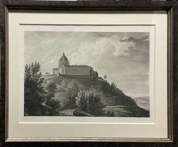 Gruppo di tre litografie monocrome raffiguranti monumenti piemontesi. In cornic