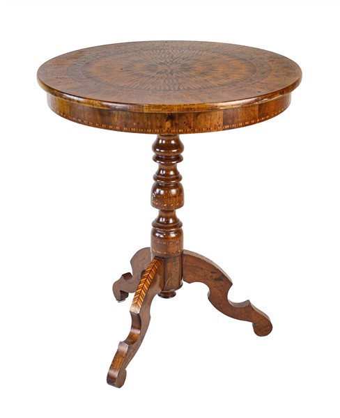 Antico tavolino circolare lastronato in bois de rose e bois de violette, piano riccamente intarsiato con decoro geometrico, sostegno tornito tripode con intarsio spinato (d. cm 59; h. cm 70) (difetti)