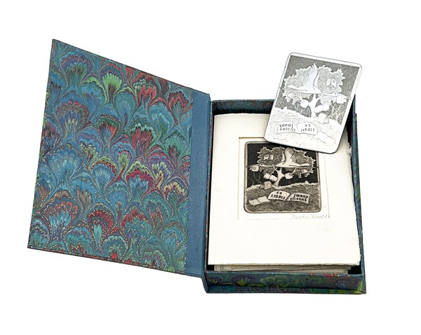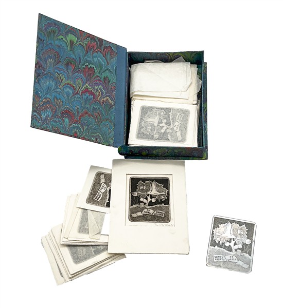 Scatola contenente una matrice e numerosi ex libris di Paolo Mus (difetti)