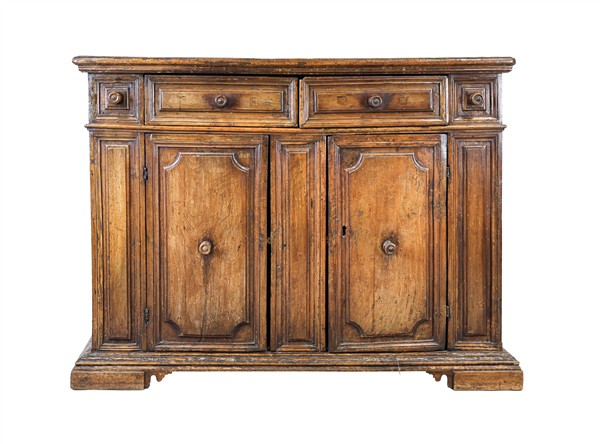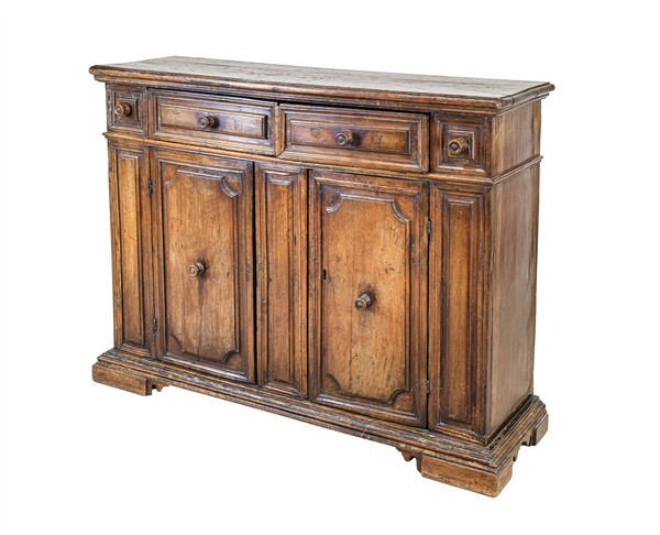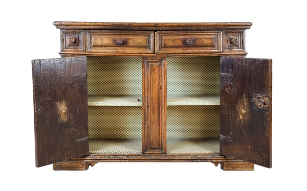 Antica credenza in noce con fronte a due sportelli, due cassetti e due finti ca