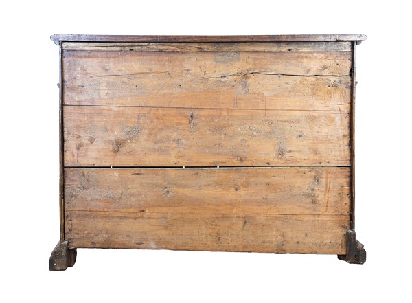 Antica credenza in noce con fronte a due sportelli, due cassetti e due finti cassetti sottopiano con bordure scanalate, piedi a mensola (cm 135x101x40) (difetti e restauri)