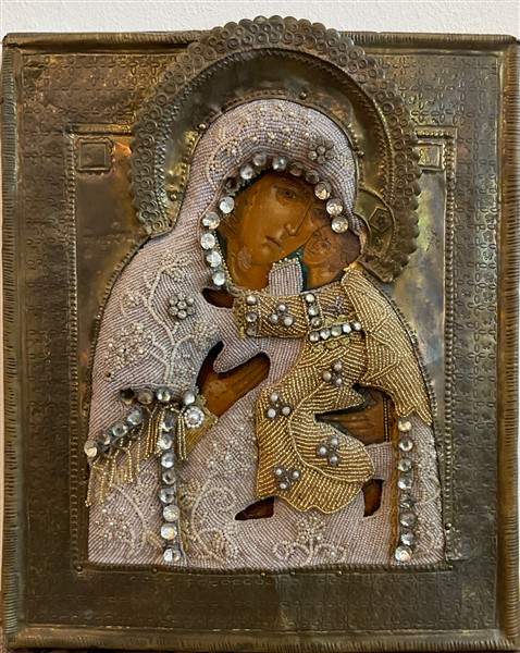 Arte russa, secolo XX. Icona raffigurante Madonna della Tenerezza, tempera su tavola, riza in metallo inciso e in parte con microperle e applicazioni vitree (cm 33x27) (difetti e mancanze)