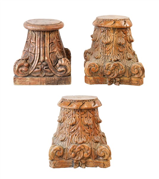 Lotto composto da una coppia di capitelli corinzi in legno intagliato, ed uno differente sempre corinzio (h max cm 47) (difetti e mancanze)