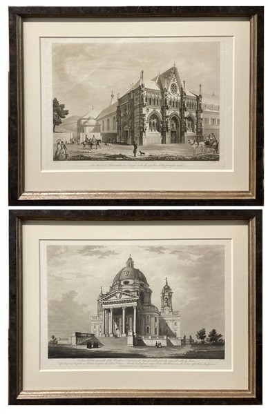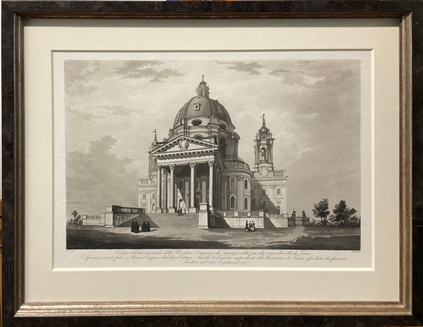 Lotto di due litografie monocrome raffiguranti chiese piemontesi, in cornici (lievi difetti)