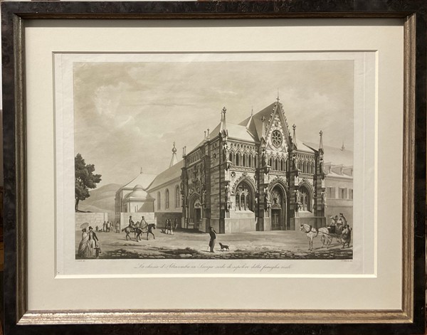 Lotto di due litografie monocrome raffiguranti chiese piemontesi, in cornici (l