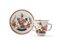 Manifattura di Meissen, secolo XVIII. Tazza biansata e piattino in porcellana policroma con decoro ''al tavolino''. Marcata sotto la base (tazza h cm 7; piattino d cm 12) (difetti)