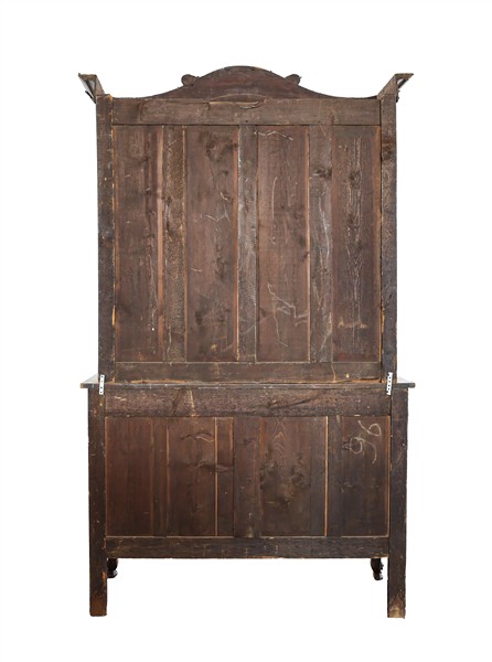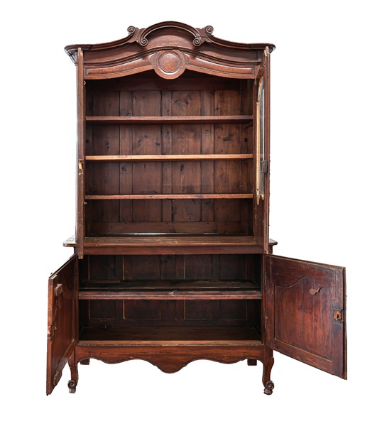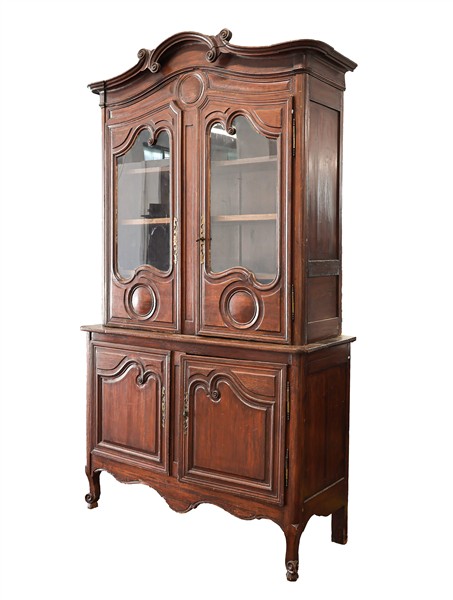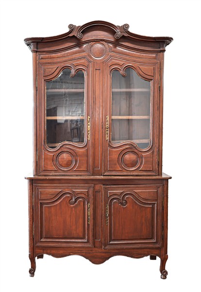 *Mobile a due corpi in legni vari, parte inferiore a due sportelli con pannellature sagomate e scanalate, parte superiore a due sportelli con vetri sagomati, cimasa a volute contrapposte. Francia, secolo XVIII-XIX (cm 140x245x52) (difetti e mancante delle chiavi)