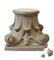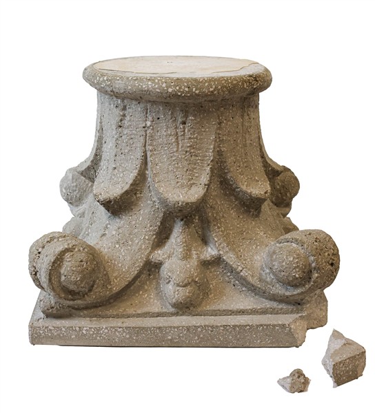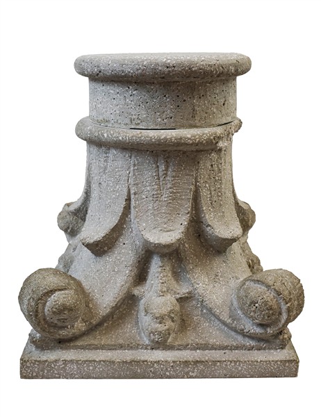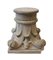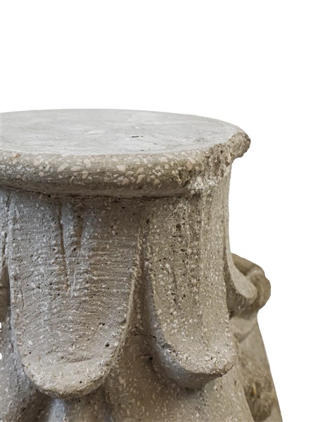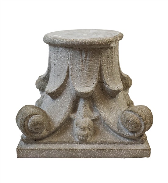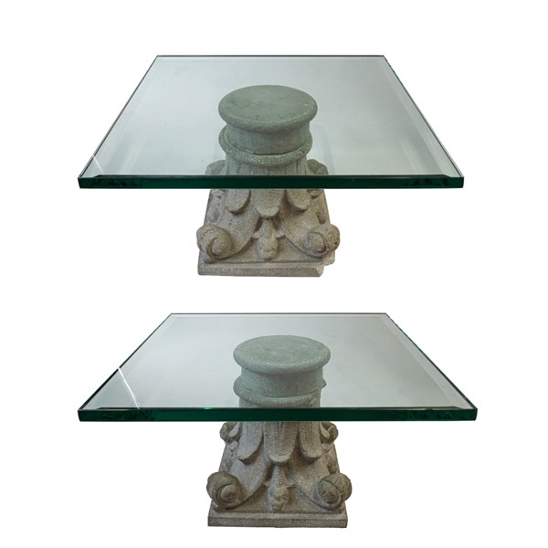 Coppia di capitelli in cemento montati a tavolino con piano in cristallo (cm 62x37x62) (difetti, mancanze e restauri)
