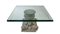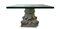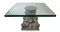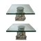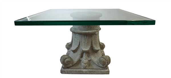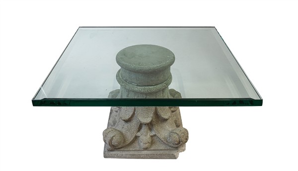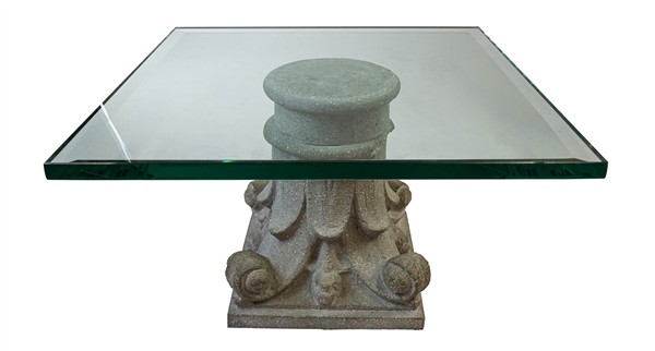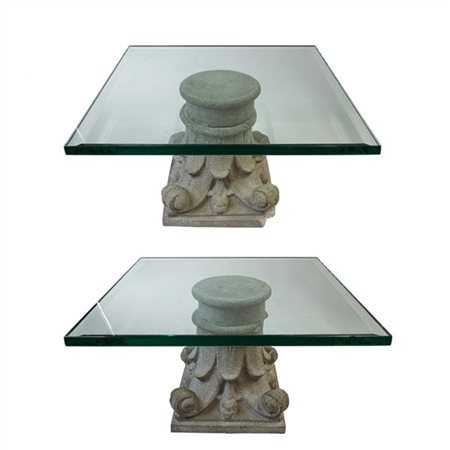 Coppia di capitelli in cemento montati a tavolino, piano in vetro.