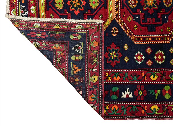 Tappeto Jagi Bedir, Anatolia, secolo XX. Decoro con tre medaglioni ottagonali contenenti internamente piccoli medaglioni romboidali su fondo rosso. Campo color blu cosparso di fiorti stilizzati (cm 196x151) (difetti)