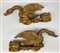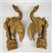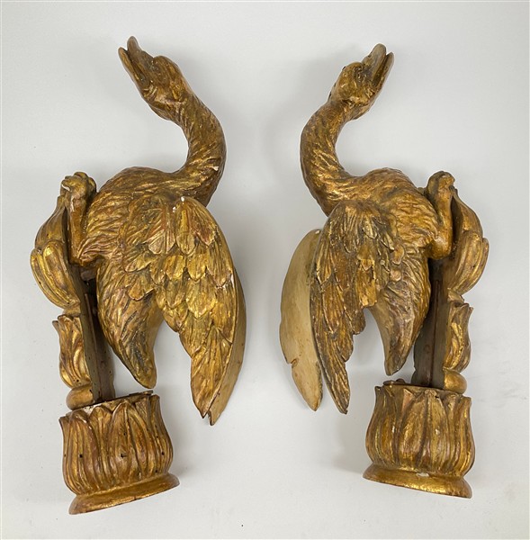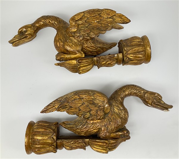 Coppia di fregi pensili in legno intagliato e dorato a forma di cigno su sostegno a foglie. Secolo XIX (l cm 40) (difetti e restauri)