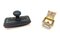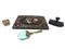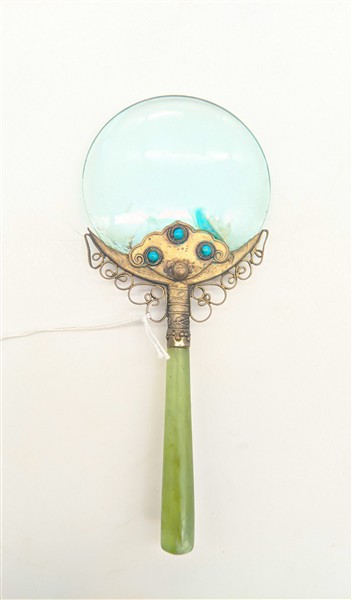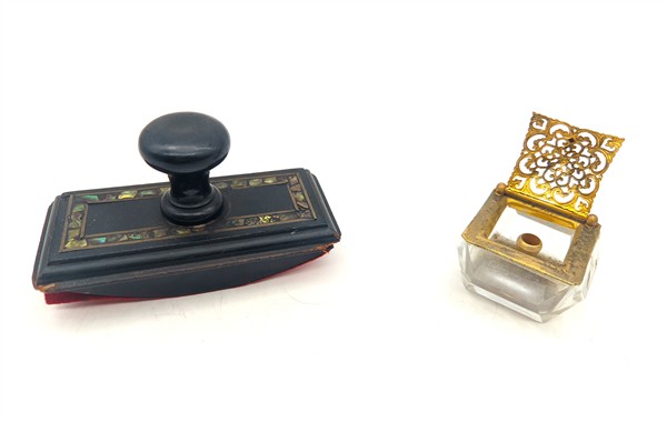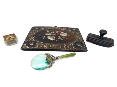 Lotto composto da un portadocumenti in papier-maché dipinto e con inserti in madreperla, un tampone per inchiostro en suite, un calamaio in vetro e metallo dorato ed una lente di ingrandimento con supporto in metallo argentato e manico in giadeite (difetti e mancanze)