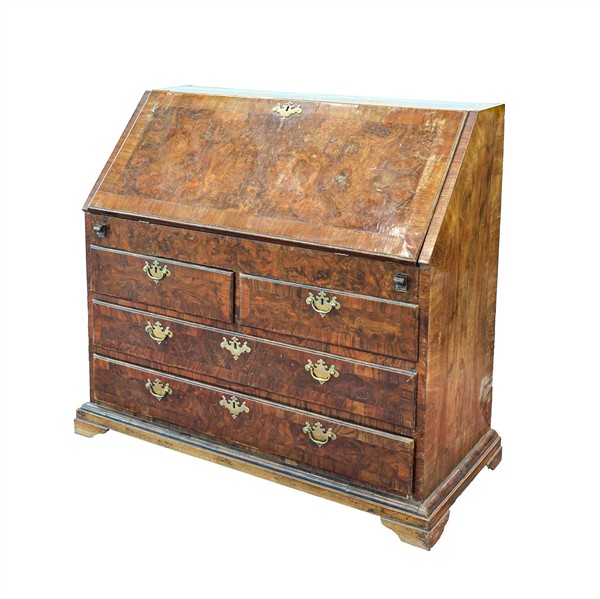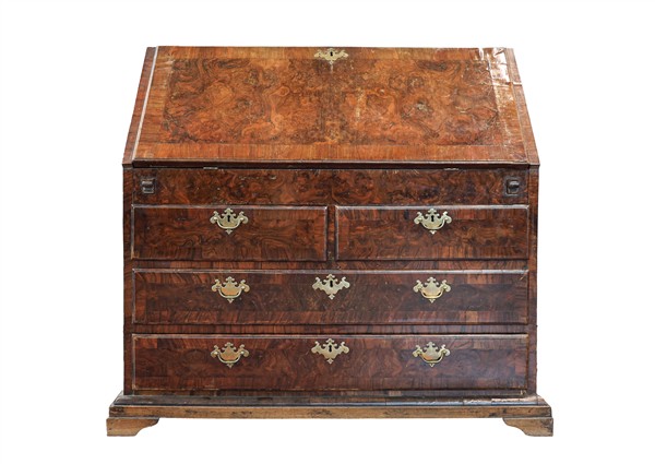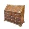 Ribalta lastronata in noce e radica con fronte a quattro cassetti di cui due allineati e calatoia celante due tiretti, vani a giorno e pianetto scorrevole che rivela diversi tiretti (cm 125x111x58) (difetti e sostituzioni)