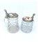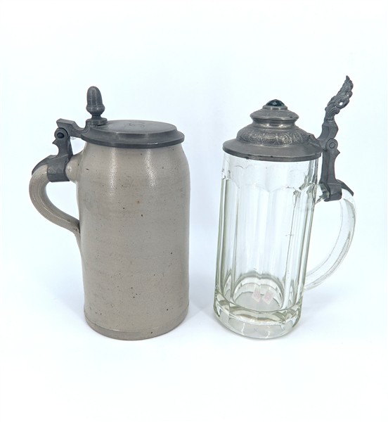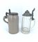 Gruppo di quattro diversi boccali da birra di cui tre in vetro e uno in ceramica con coperchi in metallo dei quali due con decorazione a smalto (h max cm 23) (lievi difetti)