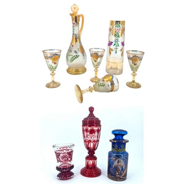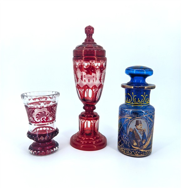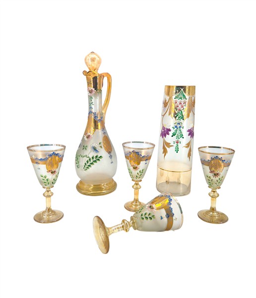 Manifatture diverse. Lotto composto da un porta essenze in vetro blu con ritratto di generale turco (Ataturk?) decorato con fregi dorati, un vaso con coperchio e un bicchiere in vetro rosso molato, una caraffa con quattro calici e vaso decorati in policromia a dorature e fiori (h max cm 36) (difetti)
