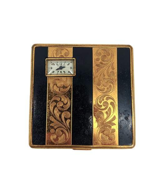 Orologio inserito in una trousse in metallo dorato e smalti (cm 7x7) (difetti)