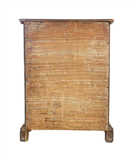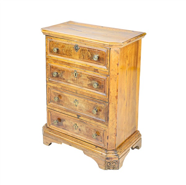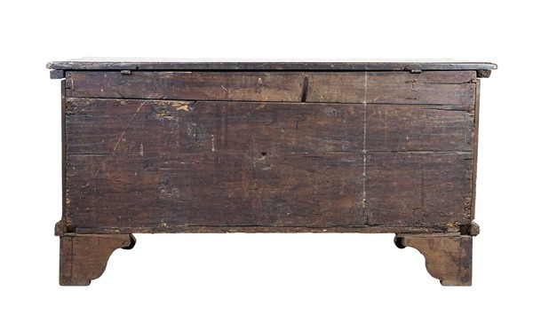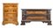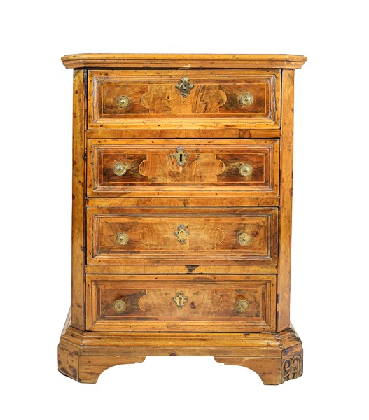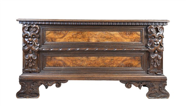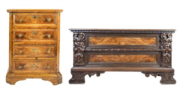 Lotto composto da una cassapanca in legno intagliato costruita con elementi antichi (cm 145x74x51) e un antico comodino a cinque cassetti lastronati e filettati con piedi a mensola (cm 66x88x39) (difetti e restauri)