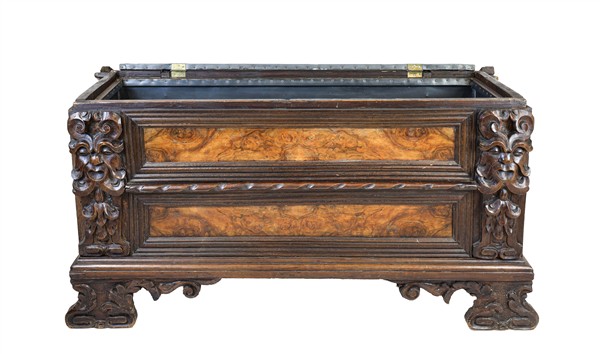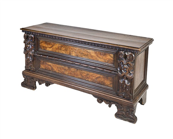Lotto composto da una cassapanca in legno intagliato costruita con elementi ant