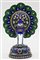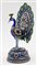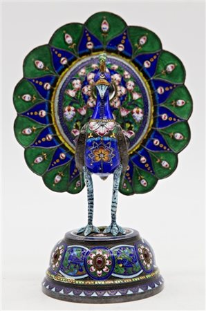 Arte indiana, secolo XX. Scultura di pavone in metallo argentato, smalti e vetri policromi