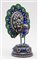 Arte indiana, secolo XX. Scultura di pavone in metallo argentato, smalti e vetr