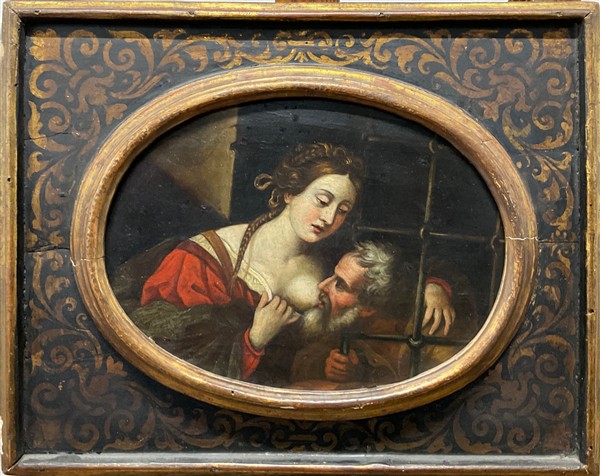 Scuola del secolo XVII "Carità romana" olio su tavola ovale (cm 26x36) in corn
