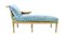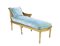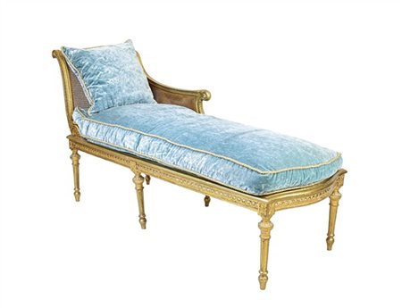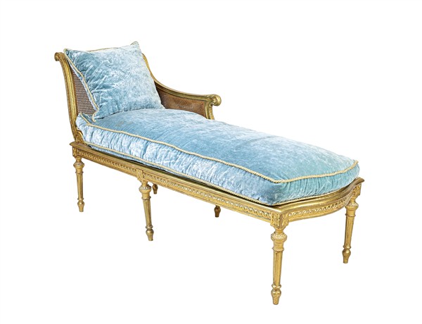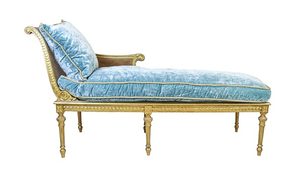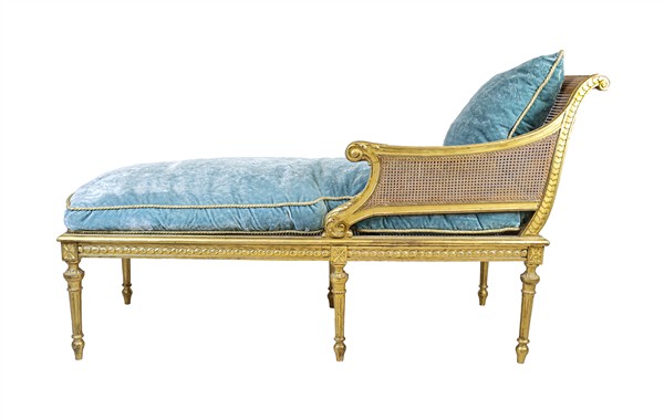 Dormeuse in legno intagliato e dorato, seduta e schienale in paglia di Vienna, gambe scanalate. Inizio secolo XX. Cuscini in velluto celeste (cm 155x96x66) (difetti)