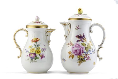 Manifattura di Meissen, secolo XIX/XX. Due caffettiere in porcellana policroma con decori floreali, profili dorati. Marcate sotto la base (h max cm 25,5) (difetti e mancanze)