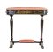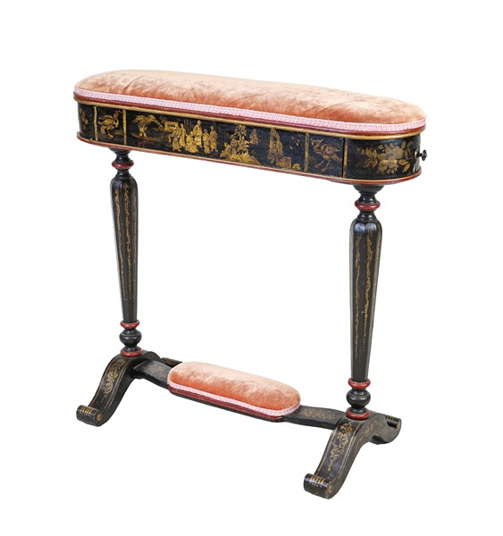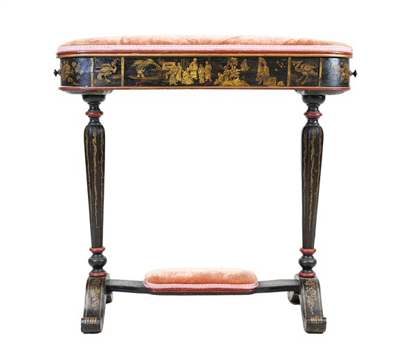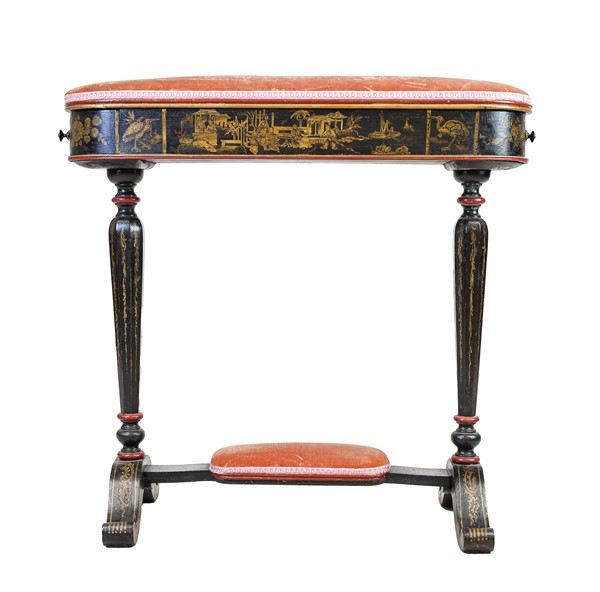 Petineuse in legno ebanizzato e laccato a chinoiserie in oro, due tiretti nella fascia laterale, ripiani rivestiti in velluto rosa, gambe scanalate riunite da traversa. Secolo XIX (cm 83x76x23) (difetti e restauri)