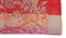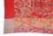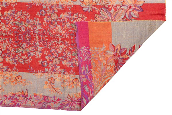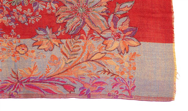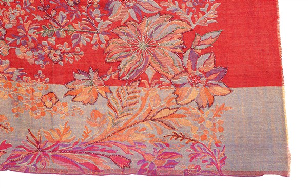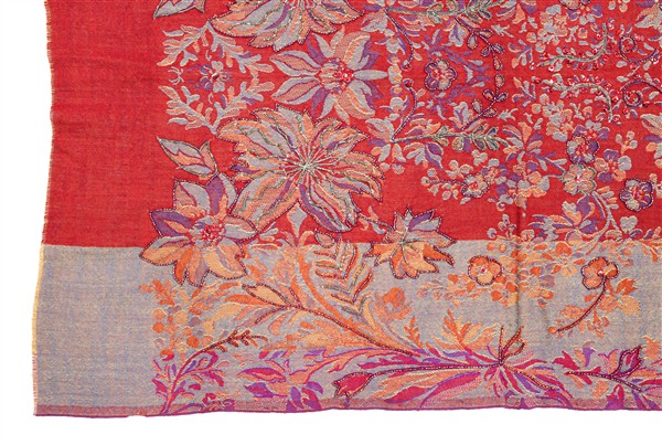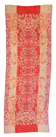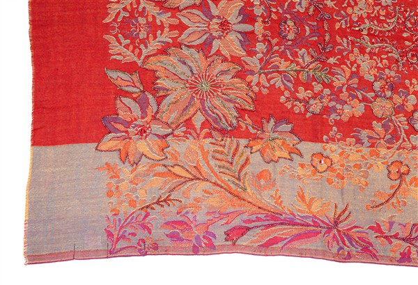 Sciarpa di recente manifattura tessuta in lana e broccata con perline di vetro iridato rosse e verdi, motivo floreale su fondo rosso e azzurro melange. Etichetta Made in India, commercializzato da Rossella Carrara, La Spezia (cm 197x73) (lievi difetti)