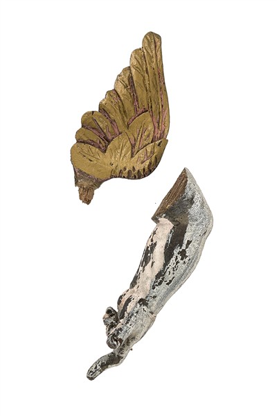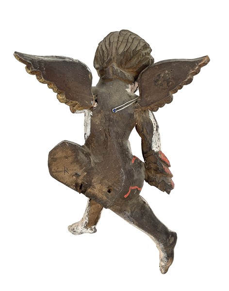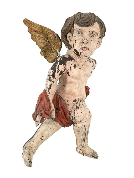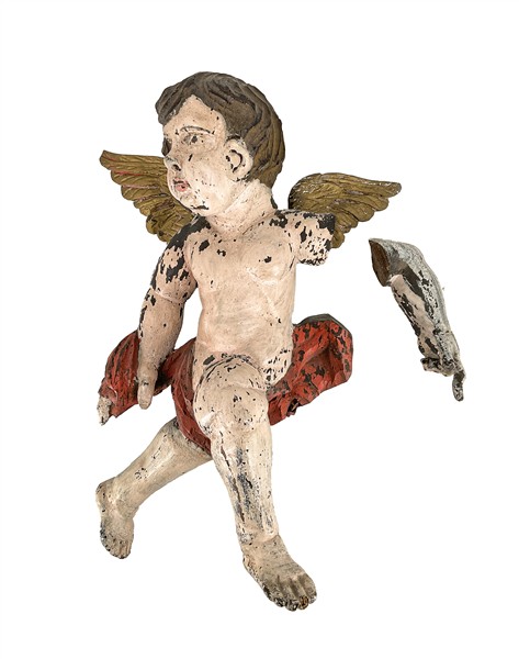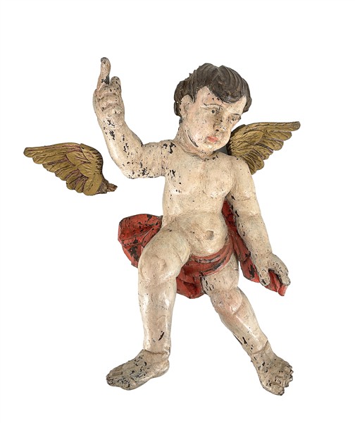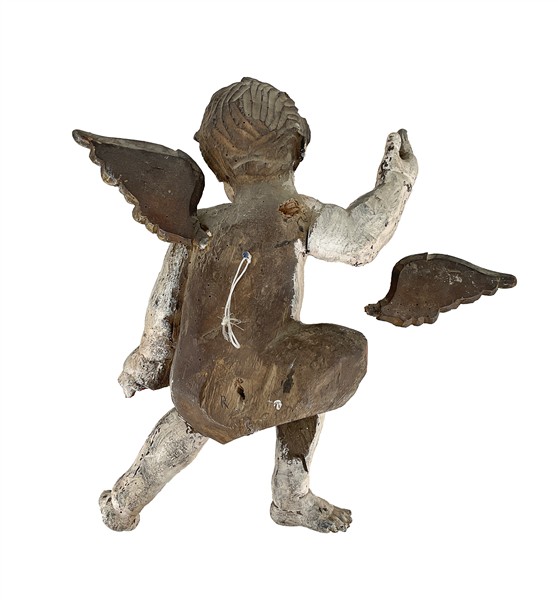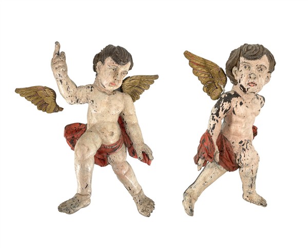 Arte del secolo XIX. Coppia di angeli in legno intagliato e dipinto (difetti, mancanze e restauri)